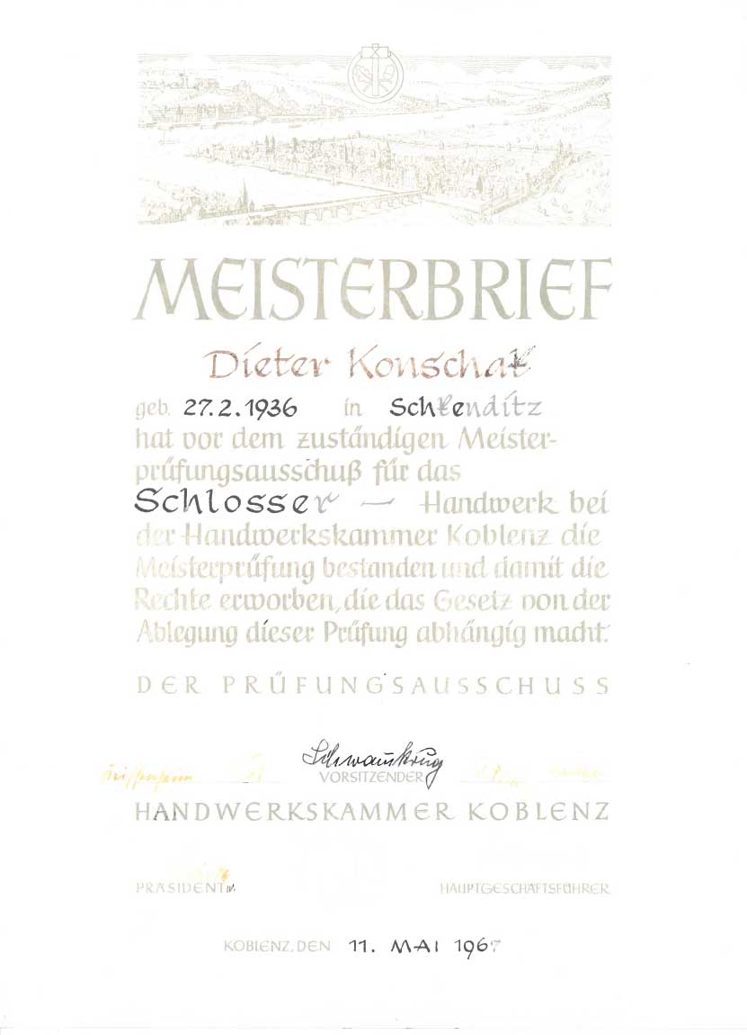 Dieter Konschak erhält Meisterbrief im Schlosser-Handwerk
