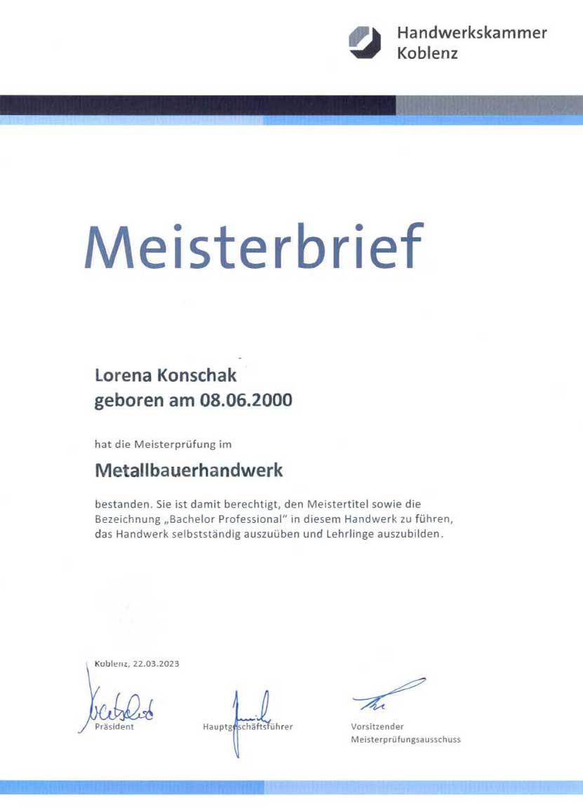 Lorena Konschak erhält Meisterbrief als Metallbauer Fachrichtung Konstruktionstechnik