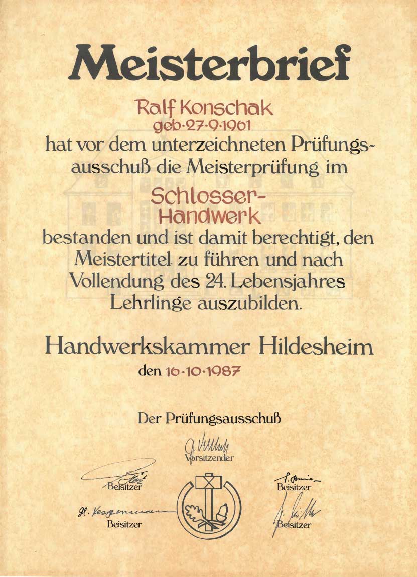 Ralf Konschak erhält Meisterbrief im Schlosser-Handwerk
